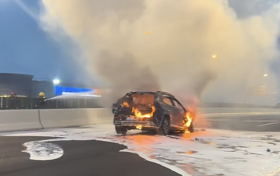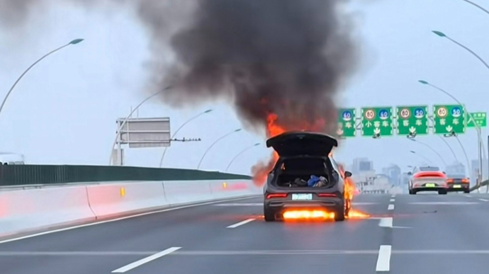 目击市民介绍,起火的是一辆沪牌SUV。当时,该车沿二号车道行至事发路段时,车辆前部冒烟起火。