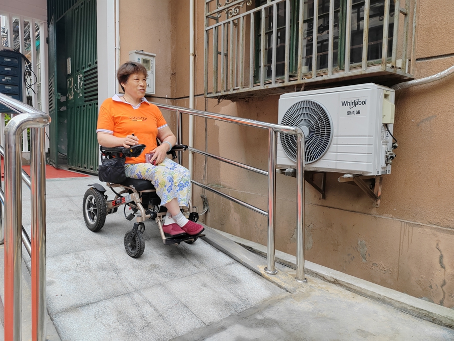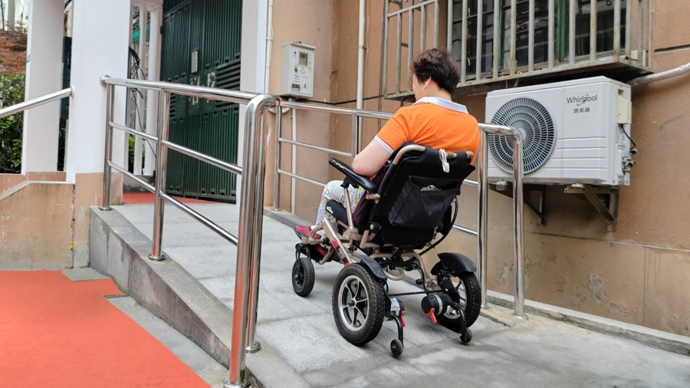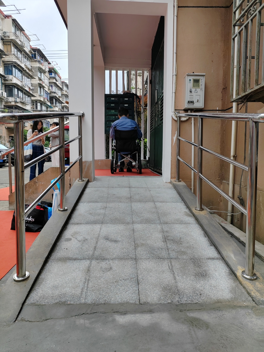 72岁的老周是肢体残疾人,日常出门依赖轮椅。随着年龄增长,他因伤病导致腰痛加剧,出行更为困难。虽然家住一楼,但是楼梯口没有坡道,让他出入十分不便。这一困难引起了长一居委会和街道的关注。今年3月,居委干部将情况上报后,社区服务办联合多部门成立专项工作小组,制定改造方案,并积极争取爱心企业捐款参与建设。同时,工作小组协同指导居民区党组织、居委会搭建沟通协商平台,通过意见征询、反复协商、现场讨论等,通过召开业主大会让改建方案通过了征询并启动建设。