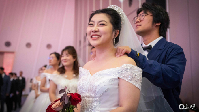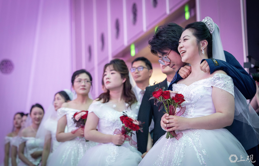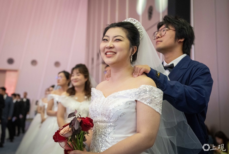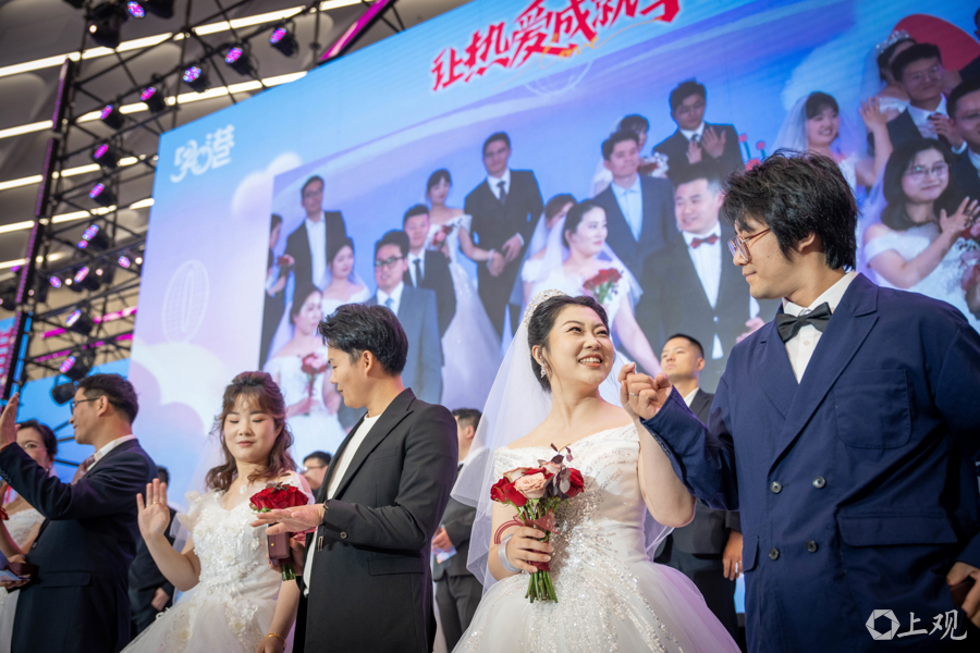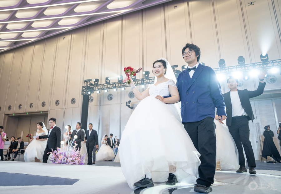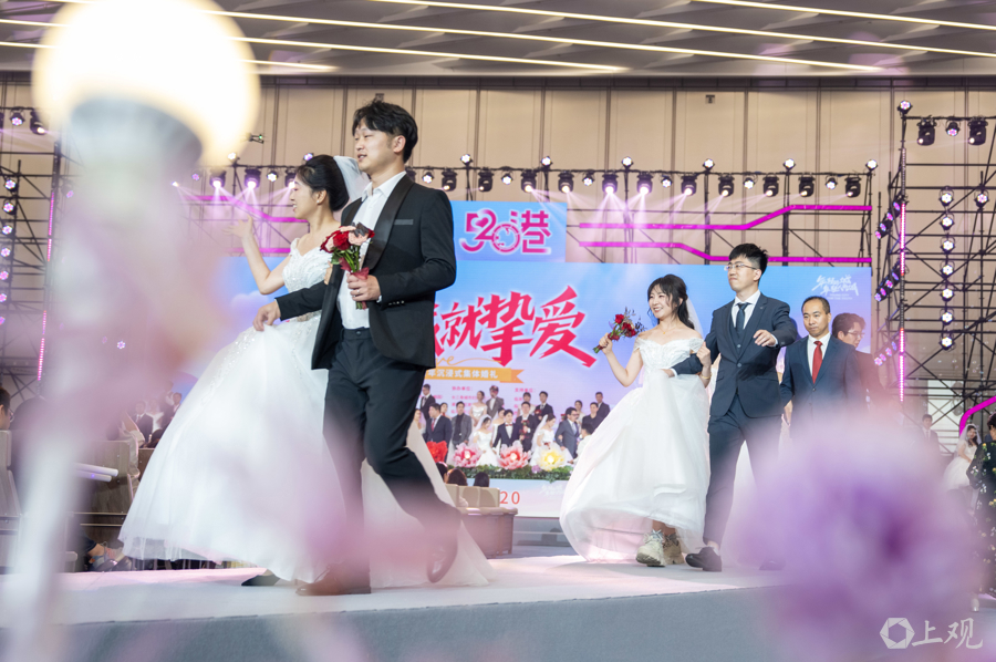 在动人的婚礼进行曲旋律中,100对新人缓缓踏上舞台,走上通往“爱意无限”的幸福通道。