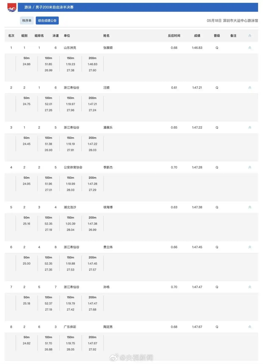 最后一组出场的潘展乐游出了1分48秒53的计时,在未尽全力的情况下获得该组第一,总成绩第四,顺利拿到了半决赛权。
