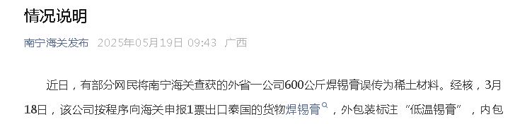 近日,有部分网民将南宁海关查获的外省一公司600公斤焊锡膏误传为稀土材料。