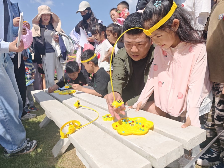 当衣襟上的康乃馨还在散发余香,生态园花海里的闯关区已切换至“疯玩模式”。首关“活力小蜜蜂”们戴上头箍,争分夺秒地对着珠盘“采蜜”,在一声声“稳住”“加油”的鼓励中,一颗颗玻璃珠被成功咬撷运送;而隔壁“花海保龄球”“‘瓶’定乾坤”区也正“砰砰”炸响,孩子们在一次次试练中逐渐找到手感,现场不时掀起阵阵欢呼;“趣味定格”打卡点更是创意无限,大小朋友们的各种pose让人忍俊不禁,既有笑点,又十分出片。这些原本只在电梯里点头的邻居,此刻正互相翻阅手机相册展示抓拍的囧照。“在集卡兑换点领奖时,有几名孩子的父母已经开始约下一场的小聚会了。”塘园居民区党总支书记金超摩挲着带着余温的集章卡笑道:“游戏会散场,但这股热乎劲儿会传递下去。”