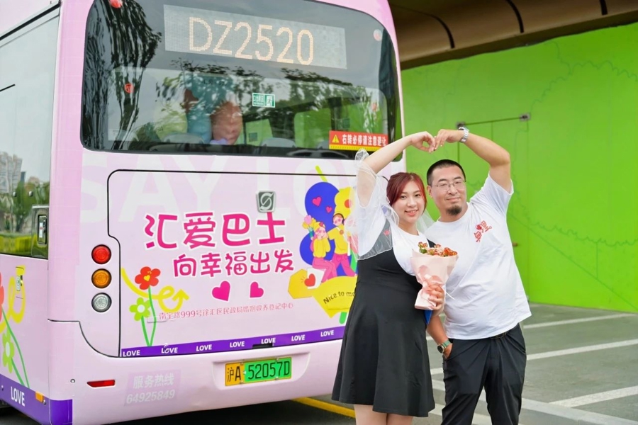 同样在今天,10对新人登上DZ2520“汇爱巴士”,从上海南站出发前往登记中心完成人生大事。
