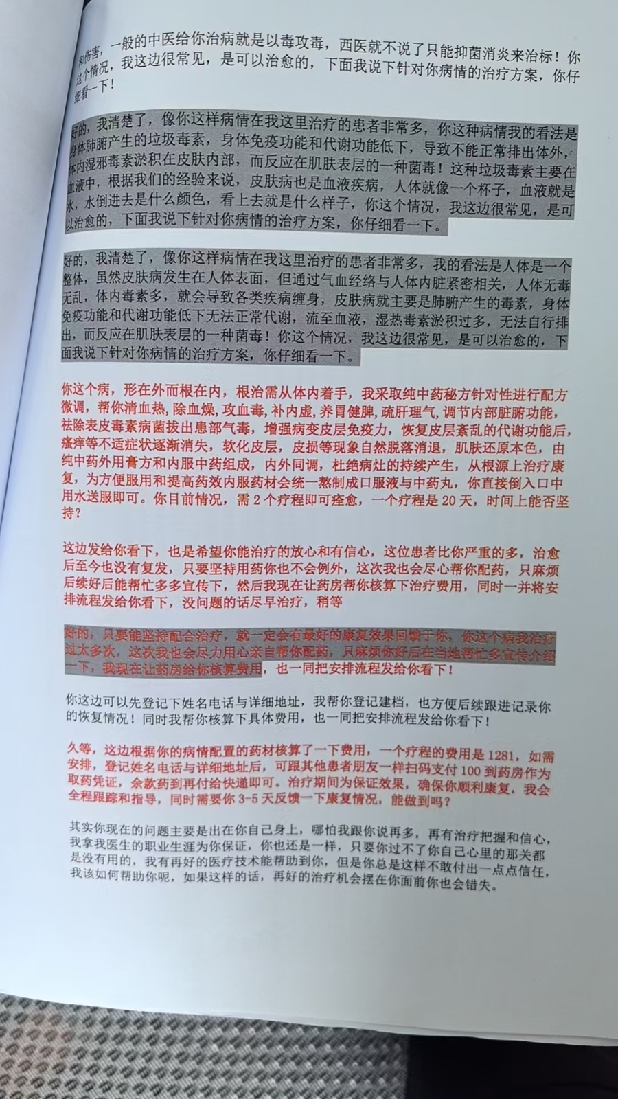 在患者发送了患处照片之后,刘某等人便会使用事先准备好的固定话术,对患者的病情作“专业解读”,并宣传虚构的所谓成功案例,以此获取患者信任。他们的最终目的,都是以“一人一方”“独家秘方”等噱头,诱骗患者购买1000元至2700元不同价位的治疗药品。而这些所谓“独家秘方”高价药品,实际是团伙从网上购入的普通抑菌膏药,成本不足售价的十分之一。而且,所有患者都是使用同样的药品,根本不存在所谓 “一人一方”。
