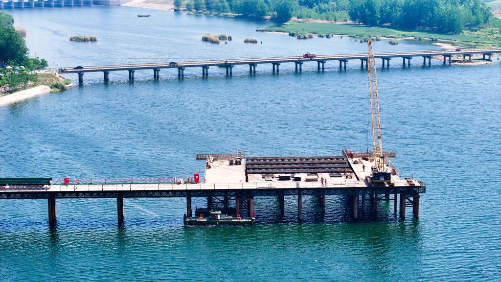 国家重点项目潍(坊)宿(迁)高速铁路项目承建方正抢抓工期与节点,稳步推进标段施工。4月30日,在潍宿高铁山东郯城段,中铁上海局的工作人员在进行沭河特大桥施工(无人机照片)。新华社记者 郭绪雷 摄