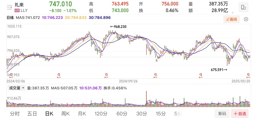与之相比,美股礼来的股价表现则更为“坚挺”,礼来股价在2024年8月22日达到了历史高点967.269美元/股,此后则保持箱体震荡,截至5月21日收盘报747.010美元/股,市值7079.7亿美元。