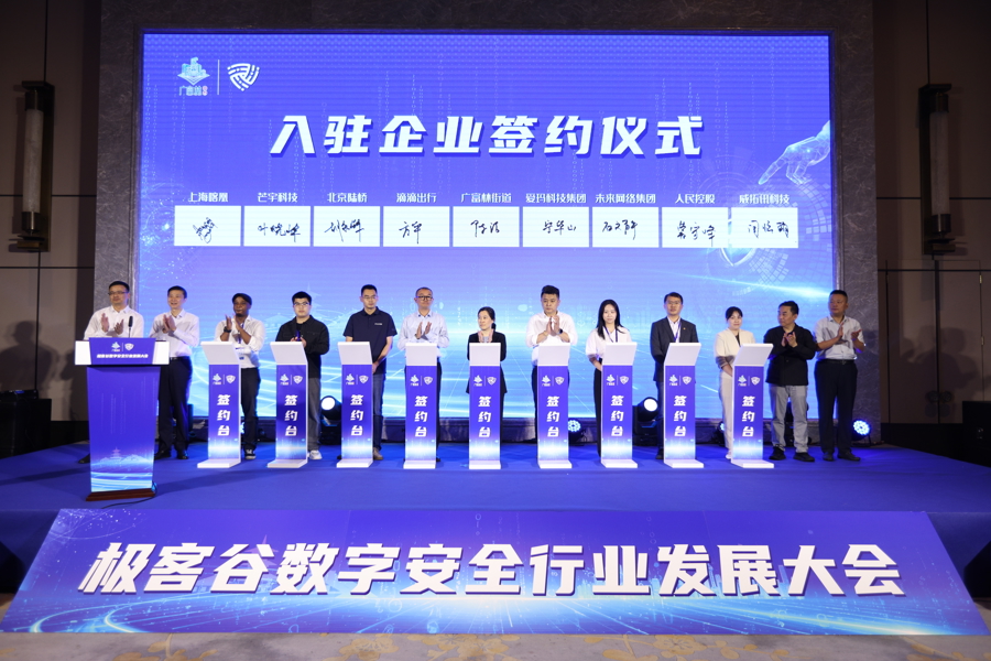 当天,极客谷数字安全产业园正式开园,与爱玛科技集团股份有限公司、滴滴出行(北京)网络平台技术有限公司等8家首批入驻企业代表签署合作协议。