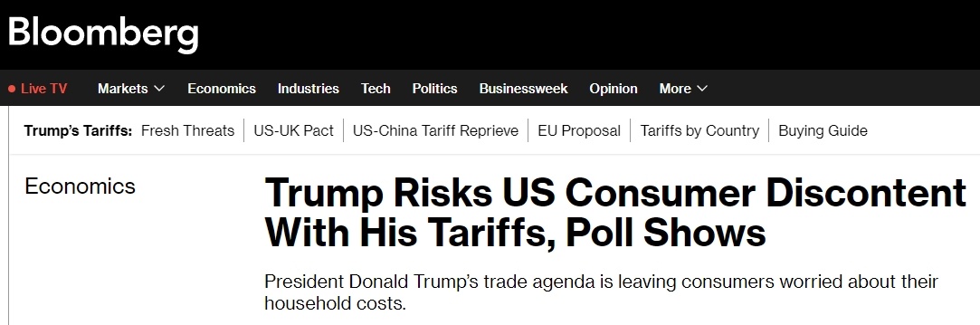 彭博社近日民调显示,56%的受访美国人认为,特朗普对其他国家征收的关税对他们的家庭财务状况产生了不良影响。即使特朗普政府一直在鼓吹加关税能让产业回流美国并增加财政收入,约52%的受访者还是表示,美政府承诺的好处不值得他们为此付出的经济代价。