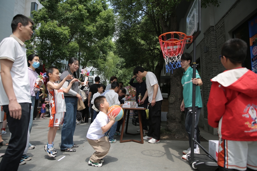 在趣味互动摊位,“弄堂游戏欢乐跳房子”摊位重现经典童年游戏,孩子们在方格间蹦跳欢笑;“魔力套圈圈”和“趣味投壶”摊位前人头攒动,参与者全神贯注,投出欢乐与惊喜;“童年追风计划”风车转转乐摊位旁,五彩风车随风转动,孩子们手持风车奔跑嬉戏。