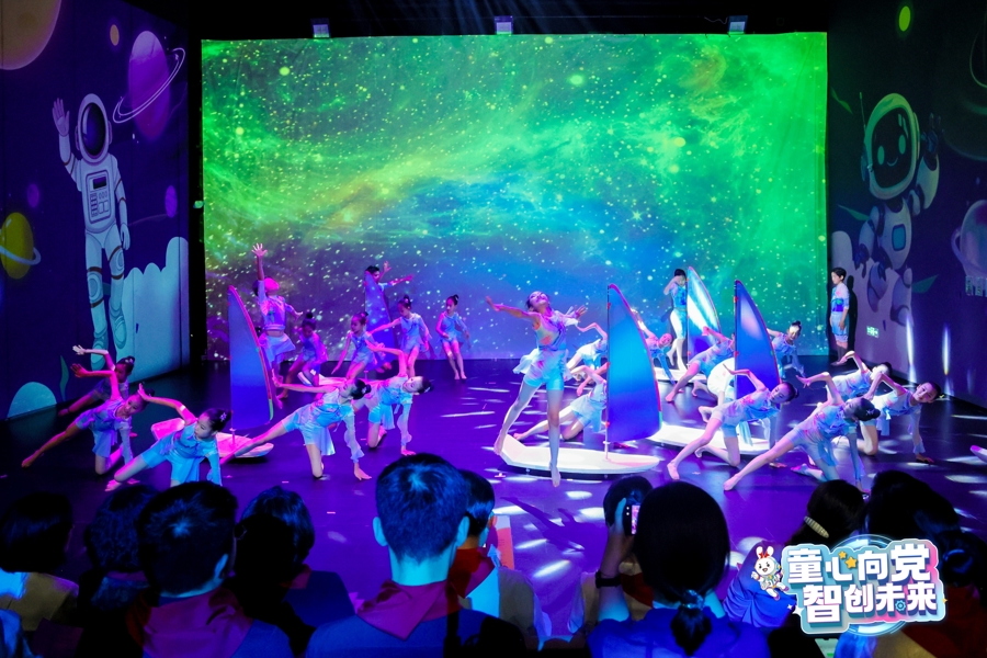 上海市静安区闸北实验小学的少先队员们带来舞蹈《星海远航》,诉说着静安少年奋楫扬帆,以时不我待的急迫感向着浩瀚的星空前进。