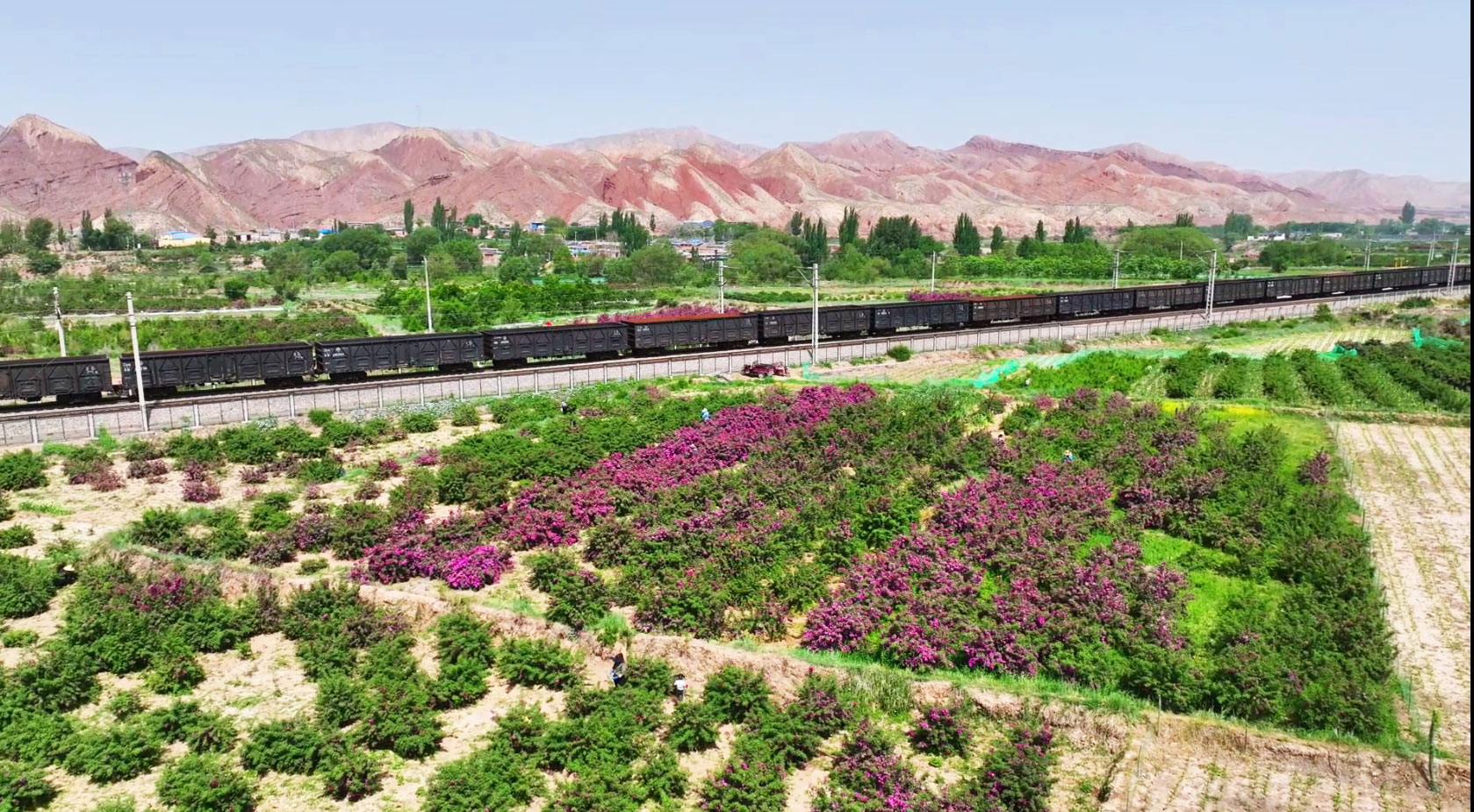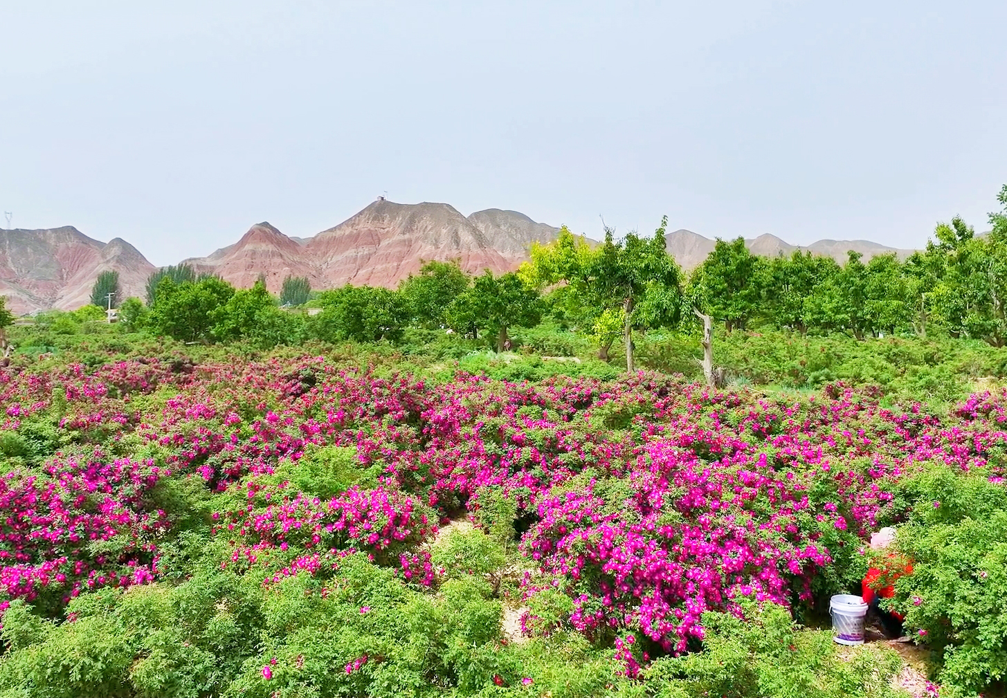 每年春末夏初,大片大片的玫瑰花,一团团一簇簇,盛开得像一幅油画,铺陈在苦水镇干枯的沟梁间。整个小镇沐浴着花香,写意又妩媚,尽情展示大西北一年之中最动人最美丽的时刻。