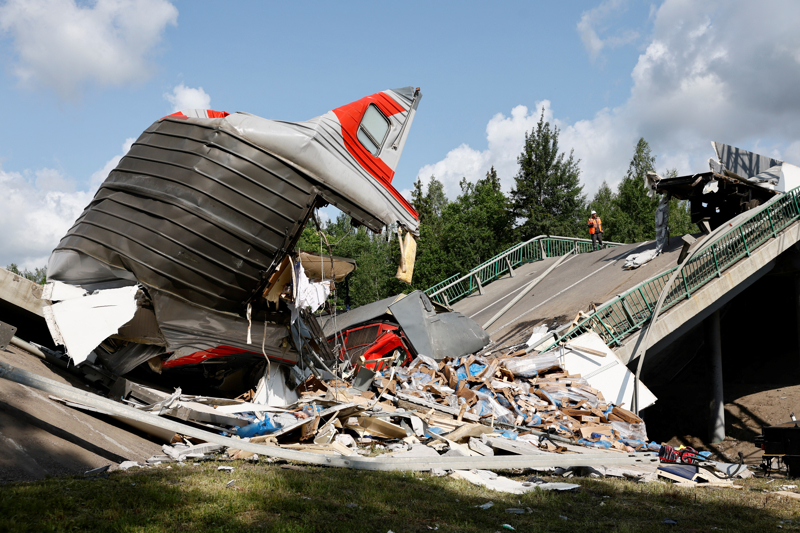 俄罗斯布良斯克州桥梁坍塌致客运火车脱轨事件现场。新华社/路透