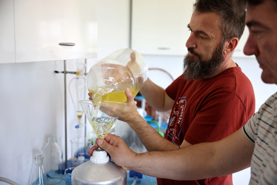 保加利亚谢诺沃村,技术员正在过滤玫瑰精油。