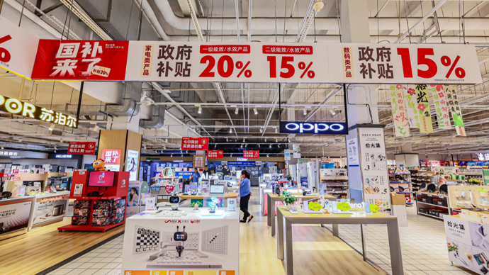 大促期间,多家大润发超市家电区域挂起“国补来了”字样的促销海报,家电类产品至高补贴20%,吸引了不少消费者。