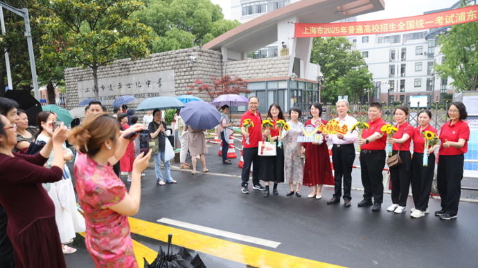 高考第一天恰逢上海入梅,早晨八点,雨水已陆续落下。在浦东新区建平世纪中学考点记者看到,考生们有序排队进入,送考老师都身着写有“金榜题名”“旗开得胜”等字样的T恤前来送考,不少家长特地穿上旗袍、手捧向日葵,为孩子加油鼓劲。