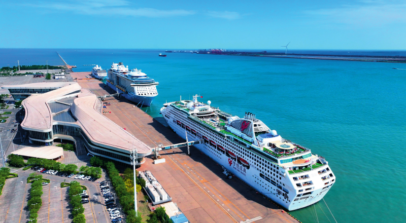 三艘国际邮轮停靠在天津国际邮轮母港(2025 年 5 月 1 日摄)赵子硕摄 / 本刊