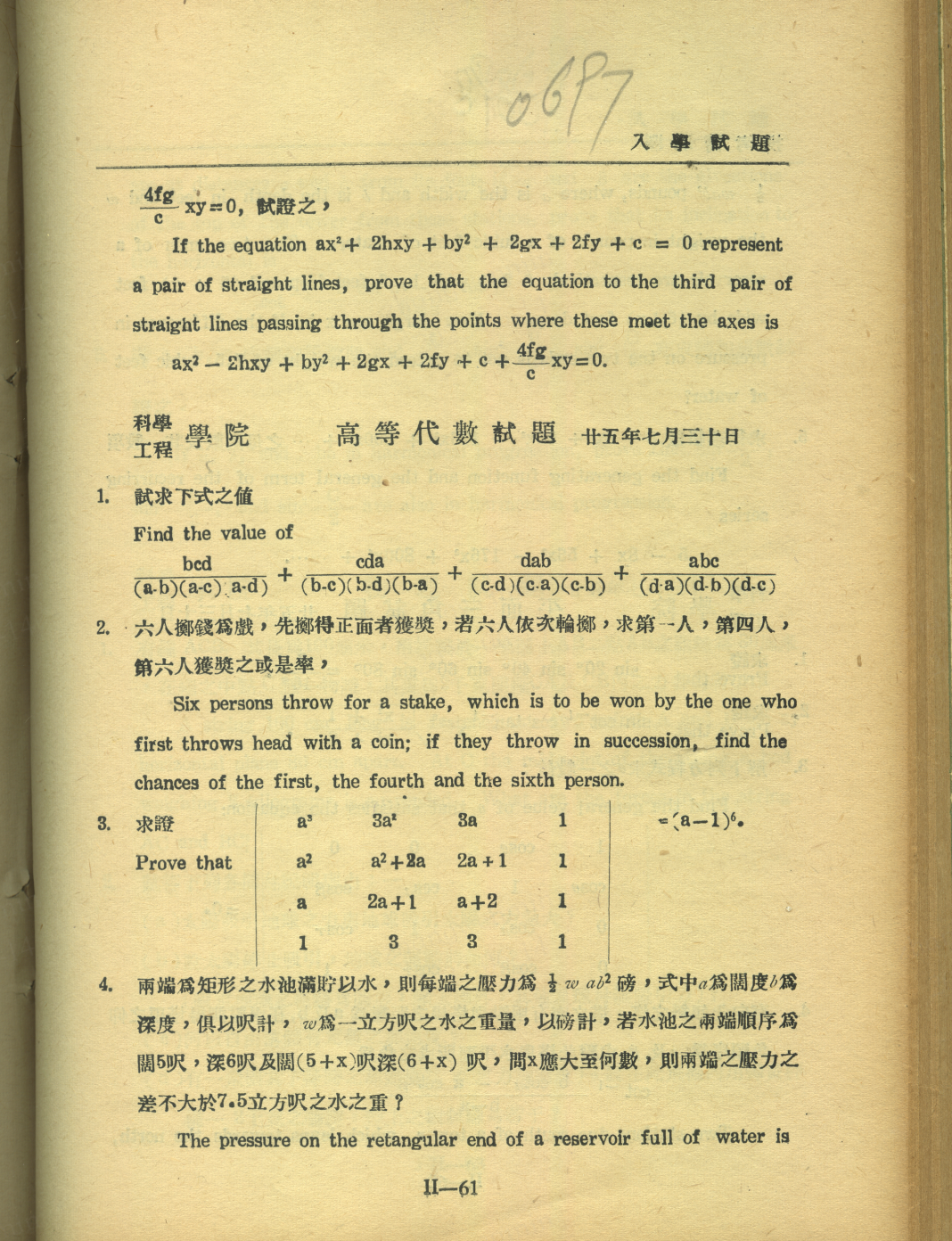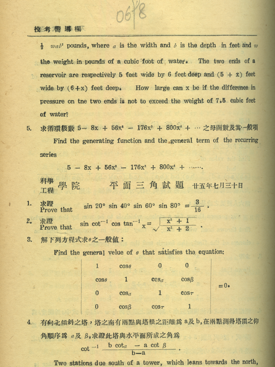1936年7月,吴文俊报考交大时的数学考题(部分)