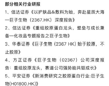 文中,华熙生物将矛头指向多家券商发布的认为透明质酸“已过时”的研究报告,而这些研报不约而同地提到了“重组胶原蛋白第一股”——巨子生物。