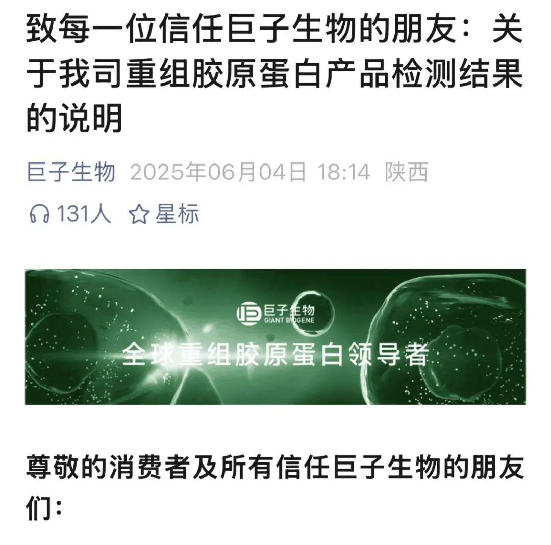 6月4日,巨子生物再发说明,对于重组胶原蛋白产品检测结果进行了系统性的解释。随后,有媒体报道称,陕西省西安市相关监管部门已经介入,但截至目前官方核查结果尚未发布。