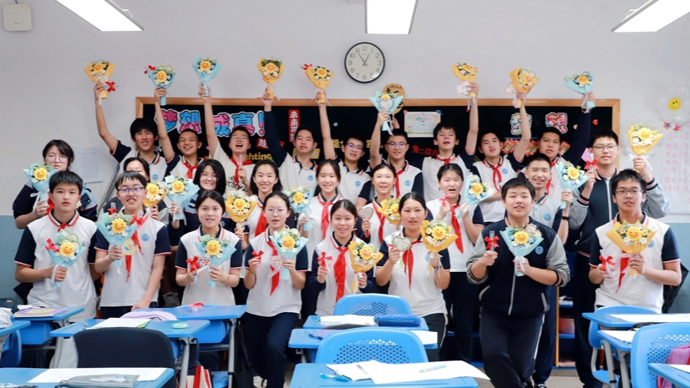 “大哥哥大姐姐,你们是我们的榜样!”……新黄浦实验学校一年级学生绘制了卡片,卡片上写着“加油”“必胜”,虽然字迹略显稚嫩,但满载祝福,五彩爱心和笑脸跃然纸上。在学校“为九年级学生中考加油”的特别仪式上,学弟学妹们带着纯真的笑容,将祝福卡片送到学长学姐们的手中。学校还送上专属钢笔和寓意“一举夺魁”的向日葵花束。“打败所有难题!”“向日葵向着太阳,你们一定能考上理想的学校!”……童言童语间,是最纯粹的鼓励。