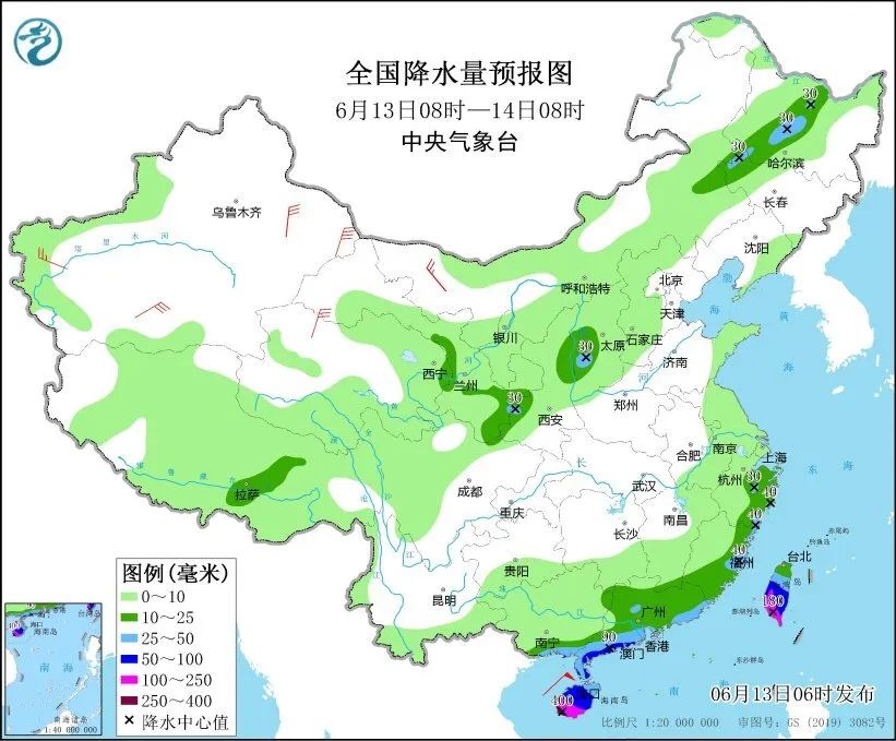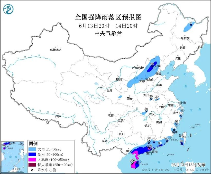 预计6月13日20时至14日20时,海南岛大部、广西东南部、广东中南部、福建东部和南部、浙江东北部沿海及台湾岛南部等地有大到暴雨,其中,海南岛西部、广西东南部、广东西南部等地部分地区有大暴雨,海南岛西部局地有特大暴雨;上述部分地区伴有短时强降水,局地有雷暴大风等强对流天气;此外,陕西中部、山西中北部、河北中北部、北京及黑龙江中部等地部分地区有大雨,局地暴雨,上述局地伴有强对流天气。