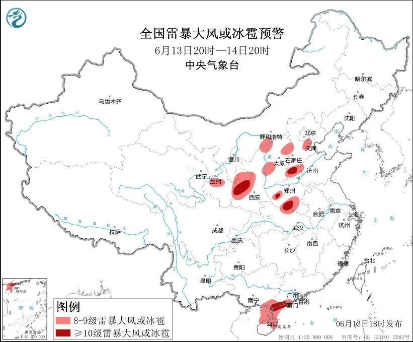 预计6月13日20时至14日20时,西北地区东部、华北、黄淮、华南南部等地的部分地区将有8级以上雷暴大风或冰雹天气,其中,甘肃东南部、陕西中西部、河北南部、河南南部和西部、湖北北部、广东西南部等地的部分地区将有10级以上雷暴大风,最大风力可达11级以上;东北地区中北部、西北地区东部、华北、黄淮、江南东部、华南南部等地的部分地区将有小时雨量大于20毫米的短时强降水天气,其中,河北中南部、北京东南部、天津中西部、河南南部、安徽北部、湖北北部、广西东南部、广东西南部等地的部分地区小时雨量大于50毫米,最大可达70毫米以上。