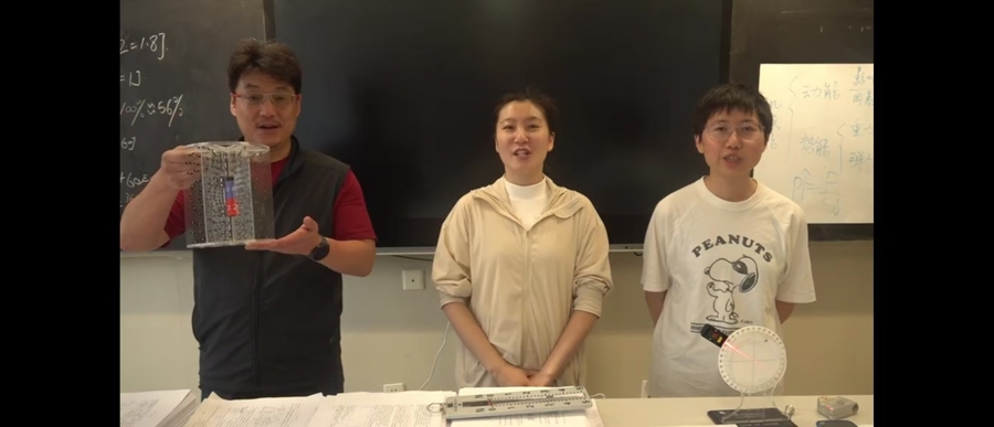 虹口实验学校物理老师们,手拿教具,为考生们祝福。