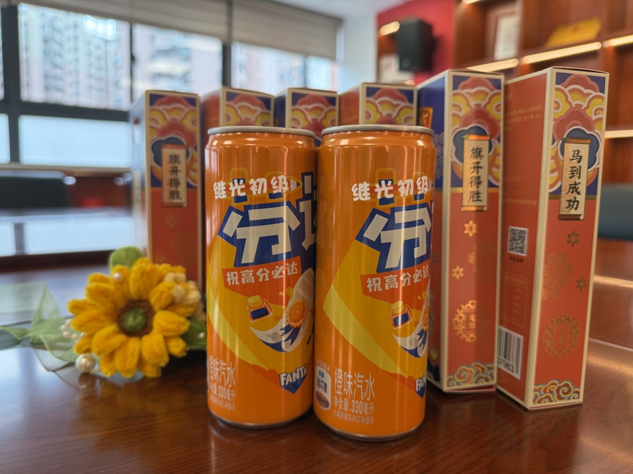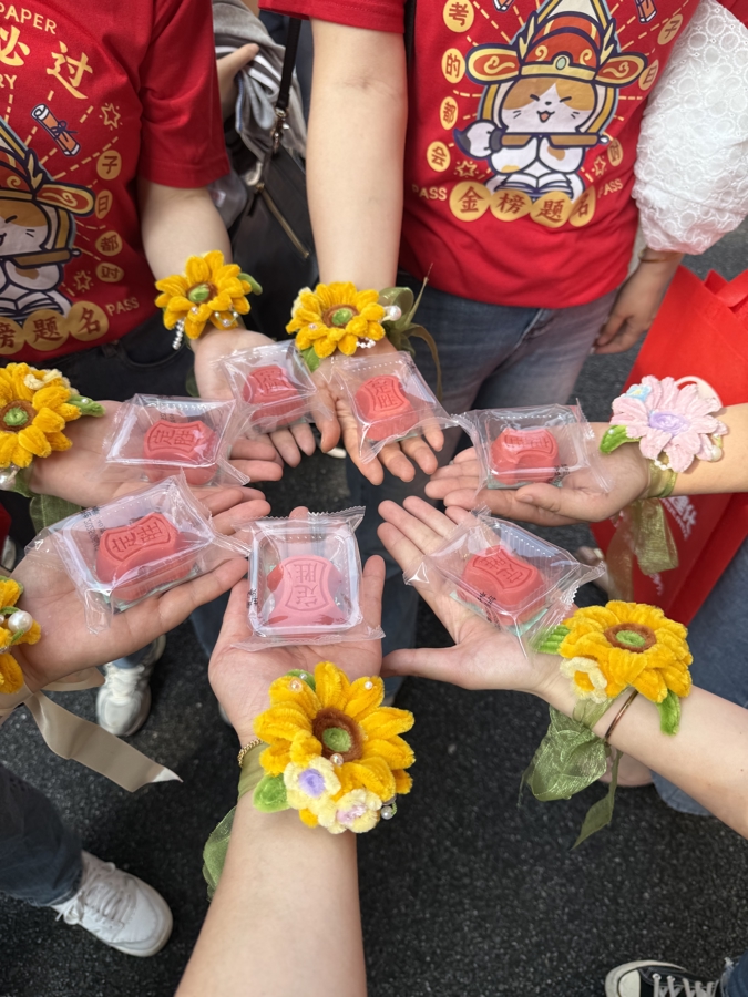 继光初级中学则为考生们定制了“芬达”,其中“芬”字的草字头类似一个火箭,箭头指向“达”字,寓意“高分必达”,以及印有“旗开得胜”“马到成功”字样的定胜糕。