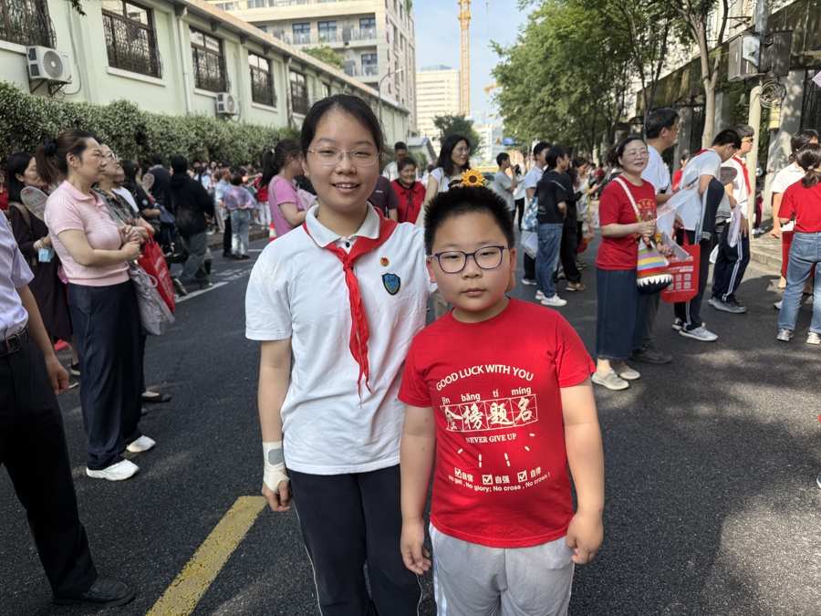 弟弟身穿红色体恤,为在继光初中读书的姐姐送考。