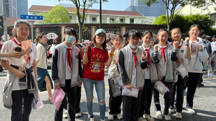 7:30,上海市继光初级中学的老师们手拿着手工制作的向日葵,身穿红色送考服,一早便在考点——上海市民办新华初级中学门口等候考生们陆续到来。