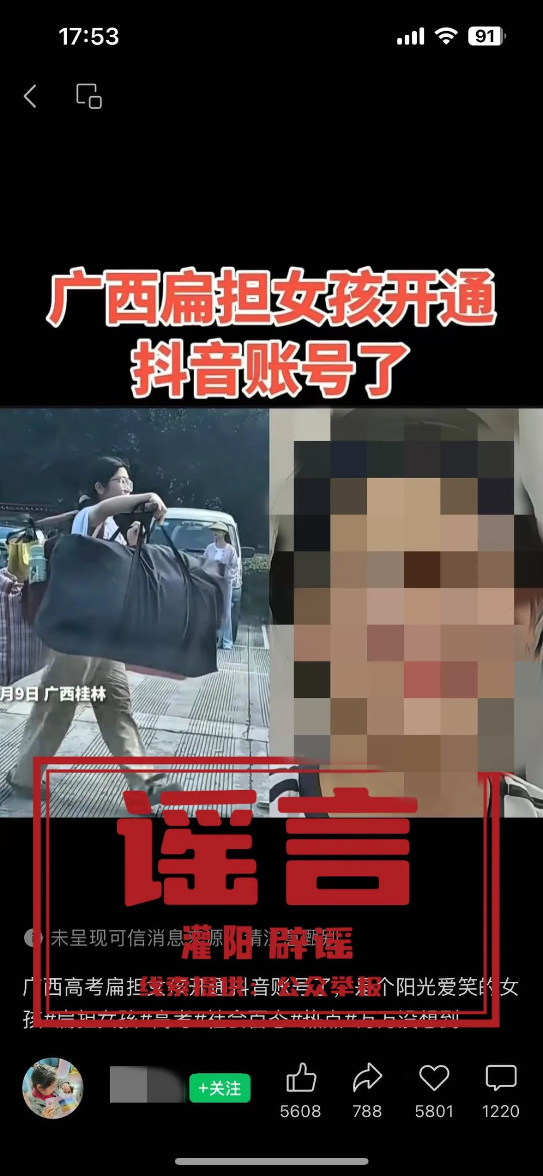 近日,有网民发帖称“广西‘扁担女孩’开通抖音账号了”。经核实,刘同学本人并未注册抖音账号,@扁担女孩刘燕,确认为假冒仿冒账号。此行为不仅侵犯了个人权益,也扰乱了网络传播秩序和公众认知。