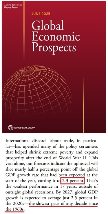 世界银行发布的最新一期《全球经济展望》报告将今年全球经济增长预期从1月的2.7%下调至2.3%,同时下调了近70%的经济体的增速。