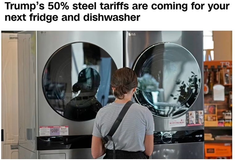 据美媒报道,美国商务部日前发布通知称,近期提高的钢铝关税也将适用于含有钢铁的消费电器。从6月23日开始,冰箱、烘干机、洗衣机、洗碗机、冰柜、烤箱、垃圾处理器等“钢铁衍生产品”也将被额外征收50%的关税。