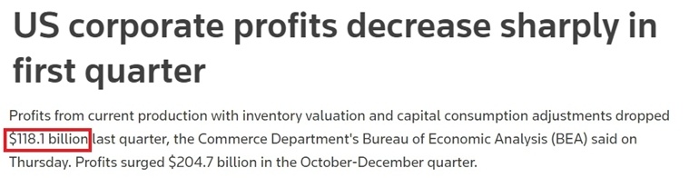 美国商务部经济分析局近日发布的数据显示,经库存价值评估和资本消耗调整后,一季度的企业生产利润减少了1181亿美元。