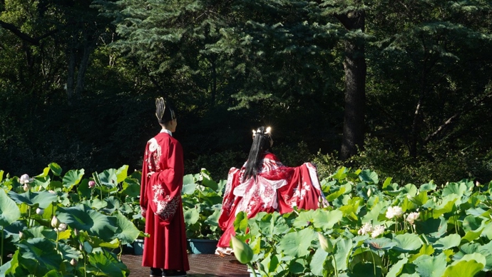 新增7处国风打卡点是今年荷花展的亮点之一。园方巧妙融合屏风、卷轴、团扇、箱匣等园林元素与自然景观,兼具沉浸式体验与互动性,让游客在赏莲之余感受传统文化魅力。此外,园方还在照壁区域、石马景点及大草坪区域精心布置园艺景点,以江南荷景为主题,演绎“最江南”的荷风雅韵。