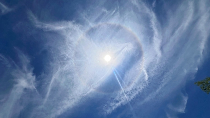今天上海上空出现巨大日晕,像给太阳戴上彩色光环。这一壮观景象也刷爆朋友圈。专家解释,这是一种高空冰晶折射阳光形成的自然光学现象。原标题:《上海现超绝日晕,你看到了吗?》 栏目编辑:肖茜颖 本文作者:新民晚报 周馨
