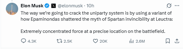 马斯克提及这场战役颇有深意。史料记载的留克特拉战役爆发日是公元前371年7月6日,与如今“美国党”成立日期非常接近。另一个巧合是,与美国两党制类似,当年的斯巴达实行独特的“双王制”,双王出身于斯巴达的两个王族,可世袭王位。该制度旨在防止国王专断,却造成斯巴达内斗不断。
