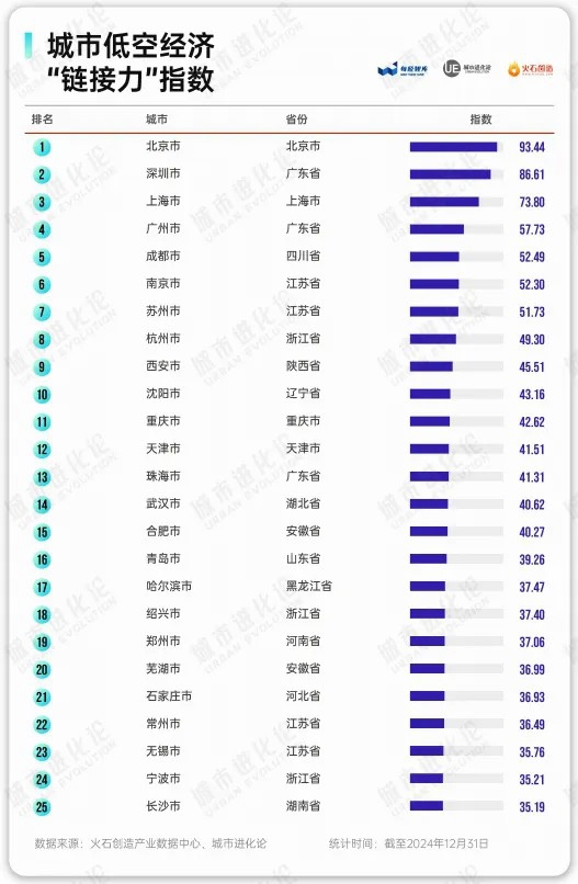 延续去年的趋势,北京、深圳、上海“领飞”地位进一步稳固,低空经济“链接力”指数得分分别为95.58、86.12、79.15,与其他城市拉开明显差距,呈现出强者愈强的态势。