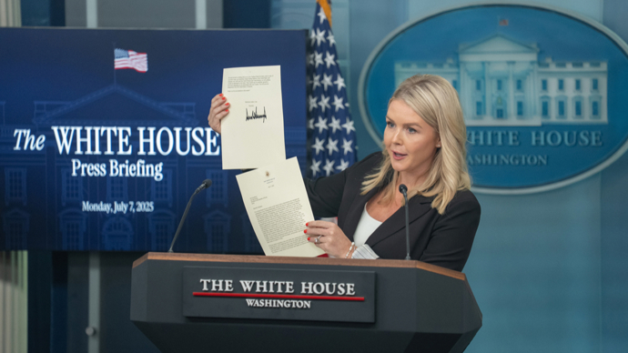 “如你所见。”白宫新闻秘书莱维特在记者会上展示这些信函说。
