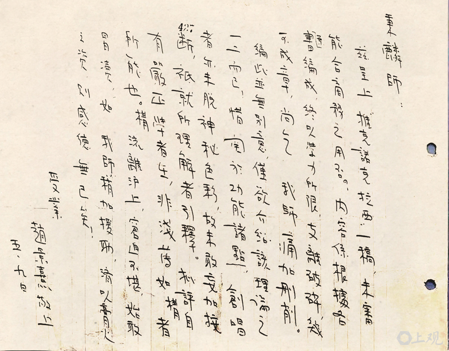 数十年研究赵超构的学者富晓春,与赵超构的女婿陈舜胜一道,根据其大学时代的履历行迹分析,这封手札的写作时间应该是在1932年。当时,上海“一·二八”淞沪抗战爆发,赵超构就读的中国公学校舍遭到日军炮火炸毁,被迫延期开学,他只得“流离沪上”。