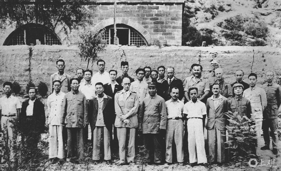 1944年6月,毛泽东、朱德、周恩来等与中外记者合影,后左九为赵超构。收入《报人赵超构》。受访者供图