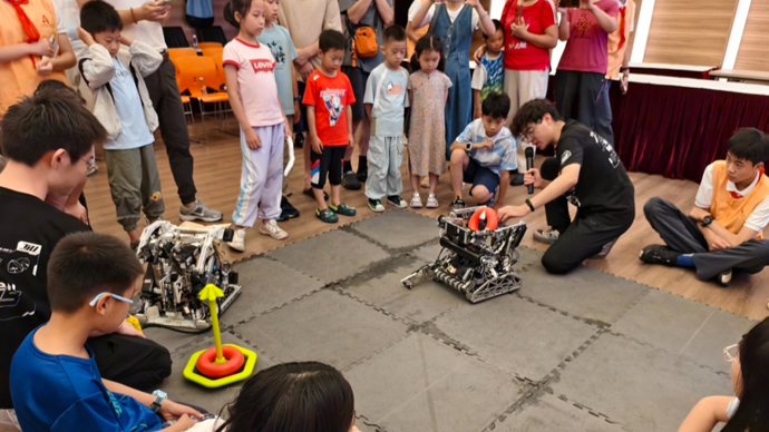同济大学VEX机器人团队向学生展示机器人的技能。