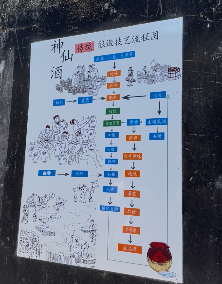 神仙酒的传统酿造工艺流程图。沈思怡 摄