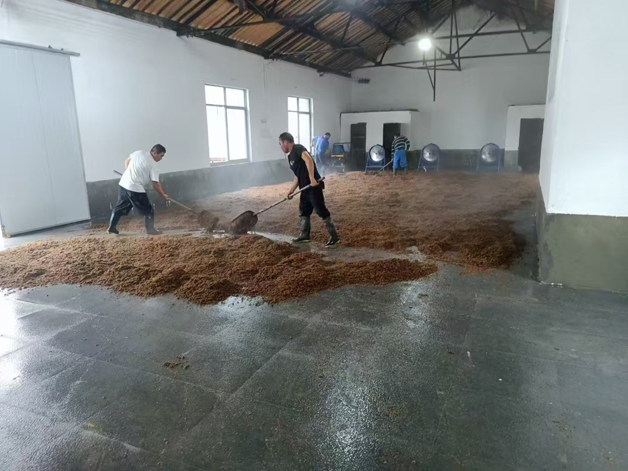 酿酒时节,游客能看到工作人员在大曲车间对酿酒原材料进行加工处理。资料图片