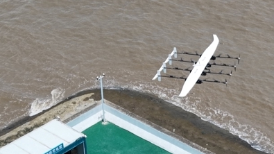 一架无人机从浙江省舟山市岱山县岱山岛起飞,12分钟后稳稳降落在岱山县钉嘴门礁,标志着长三角首条海岛低空物流试验航线开航。