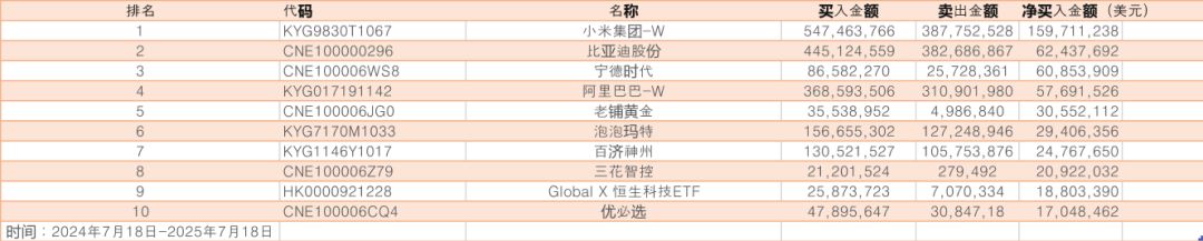 来自SEIBro的数据显示,截至2025年7月18日,过去一年,韩国股民净买入金额排名前10的港股分别为小米集团-W、比亚迪股份、宁德时代、阿里巴巴-W、老铺黄金、泡泡玛特、百济神州、三花智控、Global X 恒生科技ETF、优必选。