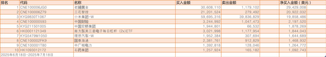 截至7月18日,过去一个月,韩国股民净买入金额排名前10的港股为老铺黄金、三花智控、小米集团-W、中国财险、中国宏桥集团、南方东英三星电子每日杠杆(2x)ETF、理想汽车-W、国泰海通、中广核电力、石药集团。