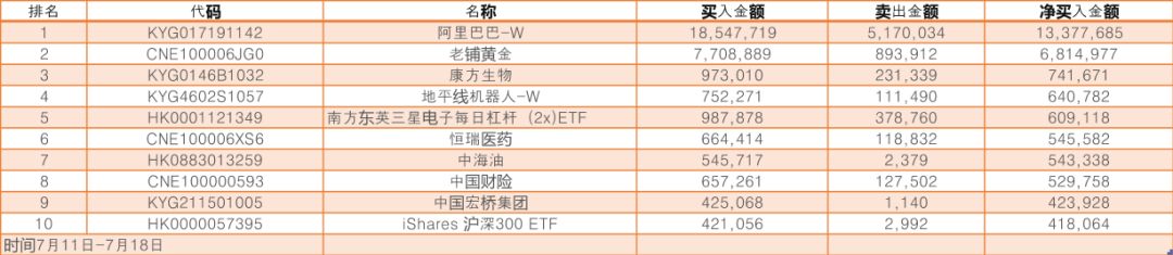 7月11日至18日,韩国股民净买入金额最多的10只港股分别为阿里巴巴-W、老铺黄金、康方生物、地平线机器人-W、南方东英三星电子每日杠杆(2x)ETF、恒瑞医药、中海油、中国财险、中国宏桥集团、iShares沪深300ETF。