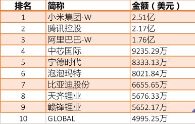 其中,韩国股民持有小米集团-W市值2.51亿美元,持有腾讯控股市值2.17亿美元,持有阿里巴巴-W市值1.76亿美元,持有中芯国际市值为9235.29万美元,持有宁德时代市值8333.13万美元,持有泡泡玛特市值8021.84万美元,持有比亚迪股份市值6655.65万美元,持有天齐锂业市值5676.33万美元,持有赣锋锂业市值5652.17万美元,持有GLOBAL市值4995.25万美元。
