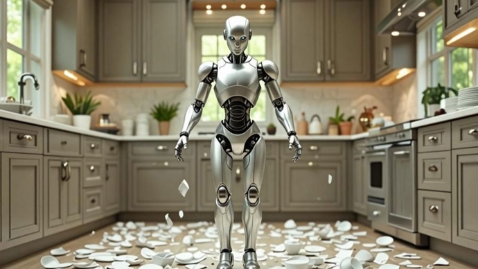 “买了一款人形机器人,训练它做家务。但现实很残酷,在打碎八个盘子后,它竟围着一堆碎片跳科目三。”